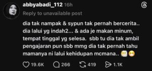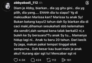 “Dia tak nampak jatuh bangun saya dalam perkahwinan dan saya pun tidak pernah bercerita. Dia hanya melalui perkara yang indah-indah dan lengkap dengan makanan, minuman serta tempat tinggal yang selesa. Sebab itu dia tidak ambil pengajaran pun sebab memang dia tidak pernah tahu mamanya ini lalui kehidupan bagaimana,” tulisnya. Sementara itu, dalam hantaran lain, Abby menegaskan bahawa dia tidak akan berdiam diri selepas ada segelintir pihak memintanya untuk membiarkan Marissa menguruskan rumah tangganya sendiri.