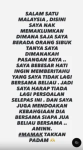 Dia pada masa sama turut mendoakan kebahagiaan bekas pasangannya itu walau dengan siapa sahaja wanita tersebut bersama pada masa akan datang. “Saya harap tiada lagi persoalan selepas ini dan saya juga mendoakan kebahagiaan dia bersama siapa jua beliau bersama. Amiin,” katanya lagi. Perkongsian itu turut disertakan dengan tanda pagar #MAMAK takkan padam, namun DJ Kidd tidak mengulas lanjut mengenai punca perpisahan tersebut.