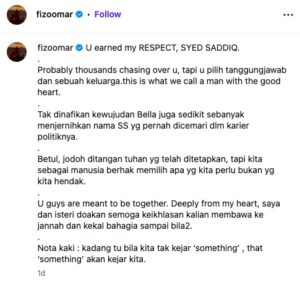 Tak dinafikan, kewujudan Bella juga sedikit sebanyak menjernihkan nama Syed Saddiq yang pernah dicemari dalam karier politiknya. Betul, jodoh ditangan tuhan yang telah ditetapkan, tapi kita sebagai manusia berhak memilih apa yang kita perlu bukan yang kita hendak. Awak berdua ditakdirkan untuk bersama.” Sementara itu, Fizo turut mendoakan agar Saddiq dan Bella dilimpahkan dengan kegembiraan bersama hingga akhir hayat.