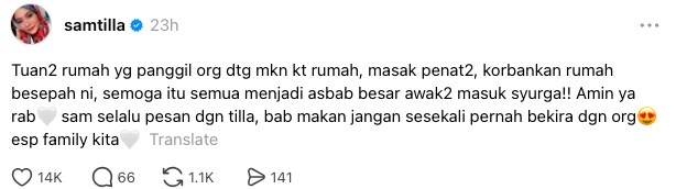 “Tuan-tuan rumah yang panggil orang datang makan ke rumah, masak penat-penat, korbankan rumah bersepah ini, semoga itu semua menjadi asbab besar awak-awak masuk syurga. Amin ya rabb,” ciapannya, semalam. Dalam masa sama, Tilla turut berkongsi pesanan suaminya yang menekankan agar tidak berkira dalam hal memberi makan, terutama kepada ahli keluarga sendiri.