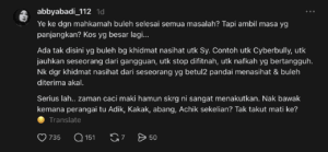 “Ye ke dengan mahkamah boleh selesai semua masalah? Tapi ambil masa yang panjangkan? Kos besar lagi… ada tak sini yang bleh bagi khidmat nasihat untuk saya. Contoh untuk Cyberbully, jauhkan seseorang dari gangguan, stop difitnah dan nafkah yang bertangguh,” tulisnya. Sementara itu, Abby menegaskan dia mencari pandangan daripada individu yang benar-benar berpengetahuan agar setiap langkah yang diambil nanti lebih tepat dan berkesan.