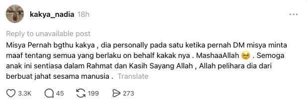“Misya pernah beritahu saya, dia personally pada suatu ketika pernah DM (direct message) minta maaf tentang semua yang berlaku bagi pihak kakaknya.” Tindakan tersebut ternyata membuatkan Nadia berasa kagum dengan Maria Danisha dan mendoakannya agar sentiasa dilindungi Allah SWT. “MasyaAllah, semoga anak ini sentiasa dalam rahmat dan kasih sayang Allah. Allah pelihara dia dari berbuat jahat sesama manusia.”