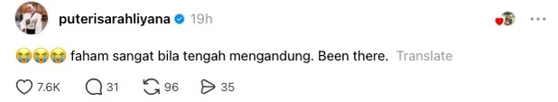 Pelakon, Puteri Sarah Liyana meluahkan rasa simpati terhadap nasib seorang wanita hamil yang didakwa dicurangi pasangan selepas tularnya sebuah video di media sosial baru-baru ini. Menerusi satu komen di Threads, Puteri Sarah atau nama lengkapnya Puteri Sarah Liyana Megat Kamaruddin, 41, berkata dia sangat memahami situasi tersebut kerana pernah melalui pengalaman yang sama sebelum ini.