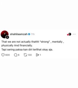 Sebagai anak sulung, penyanyi Shila Amzah akui tidak sekuat yang disangka umum. Menerusi perkongsian yang dimuat naik di Threads, seorang individu dilihat mengajukan soalan berkenaan anak sulung. “Sebagai anak yang paling tua, apa yang anda semua harap orang lain faham?” Ciapan tersebut bagaimanapun meraih perhatian Shila atau nama lengkapnya Nurshahila Amir Amzah, 35, yang memberi gambaran seolah banyak menyembunyikan perasaan.