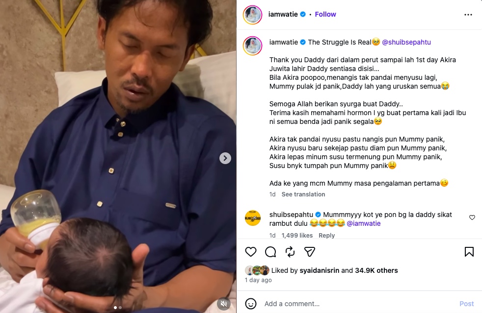 “The Struggle Is Real @shuibsepahtu. Thank you Daddy, dari dalam perut sampai lah hari pertama Akira Juwita lahir, Daddy sentiasa disisi. Bila Akira poopoo, menangis tak pandai menyusu lagi, mummy pula jadi panik, Daddy lah yang uruskan semua,” kongsinya. Tambah Watie lagi, sebagai ibu baharu, dia mengakui sering berdepan perasaan panik dalam pelbagai situasi melibatkan bayinya, termasuk ketika menyusu, menangis atau perubahan tingkah laku pada Akira.